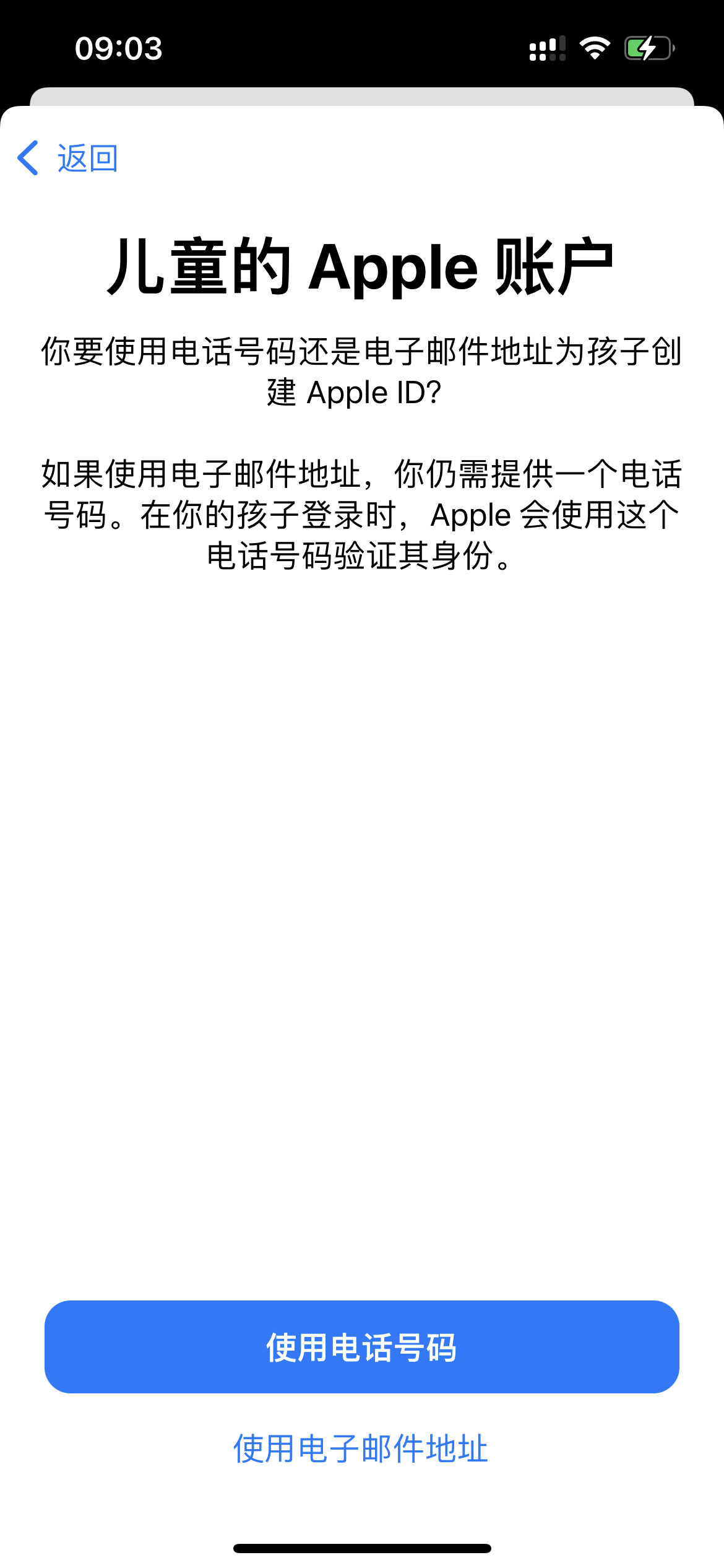 友情提示:注册儿童账号时一定要选择邮箱账号!!!如果你不想注册国内的邮箱,可以选择“没有邮件地址并获取新的 iCloud 电子邮件地址“。但是!这步以后会不会有其他的坑,那我就不知道了,因为我走的是一条更崎岖的道路!只能怪我在这步眼瞎没看到,之后的事且听我慢慢说来……